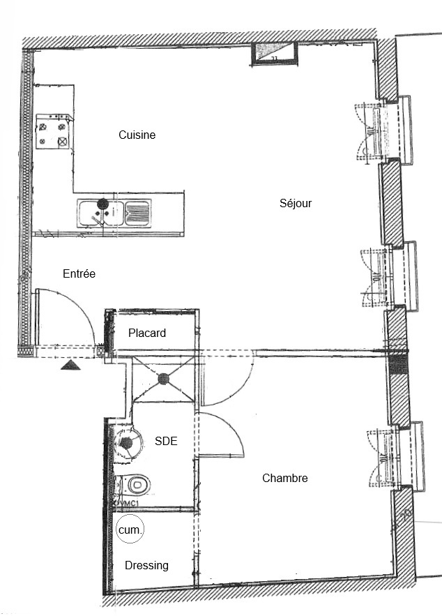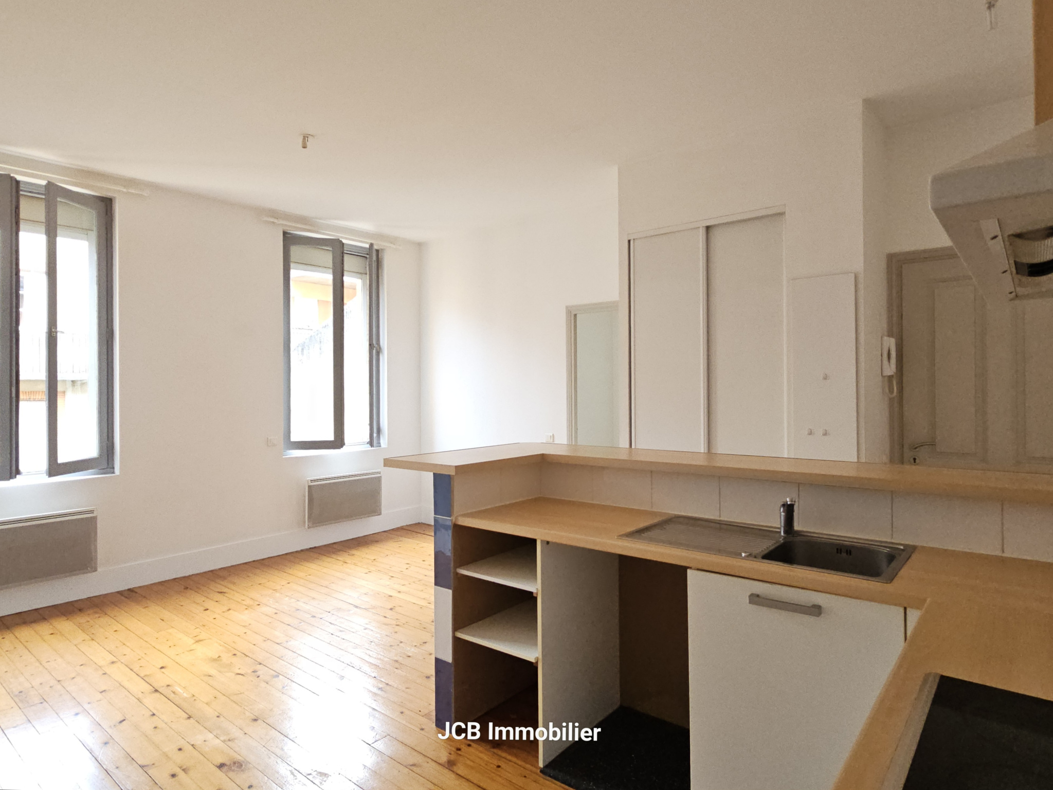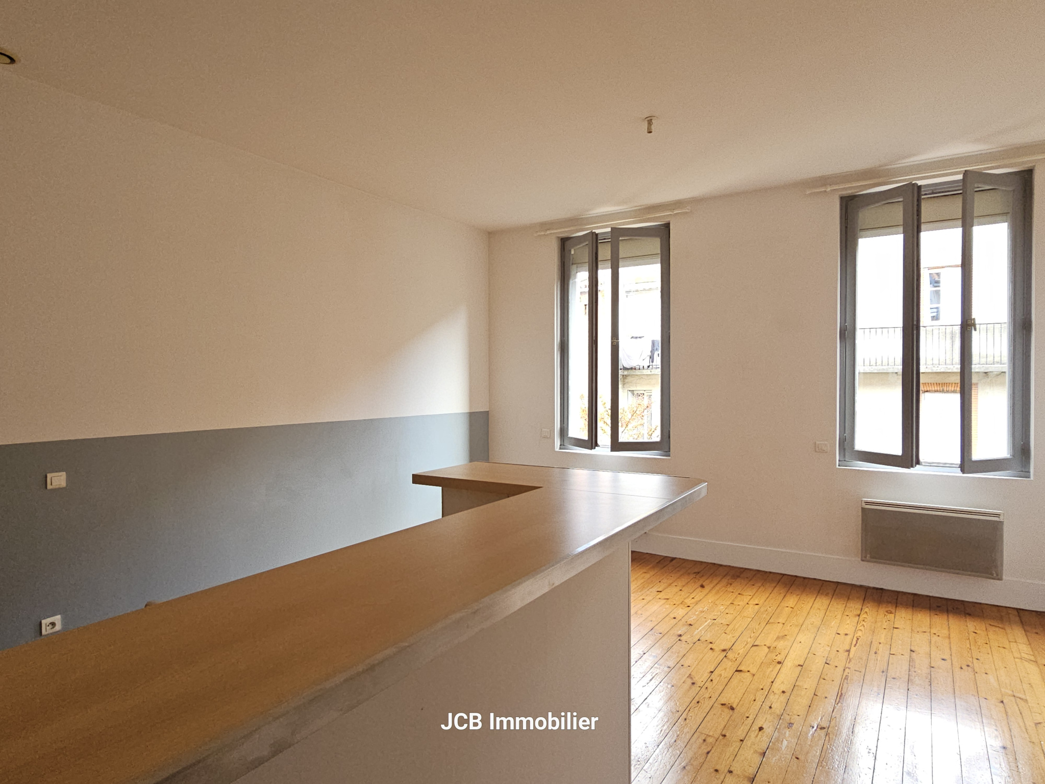 L'appartement se compose d'une entrée avec placard aménagé, un séjour avec beau parquet ancien, une cuisine ouverte aménagée semi-équipée (meubles bas, plaque de cuisson 4 feux et hotte), une chambre avec placard et une salle d'eau avec douche et WC.
