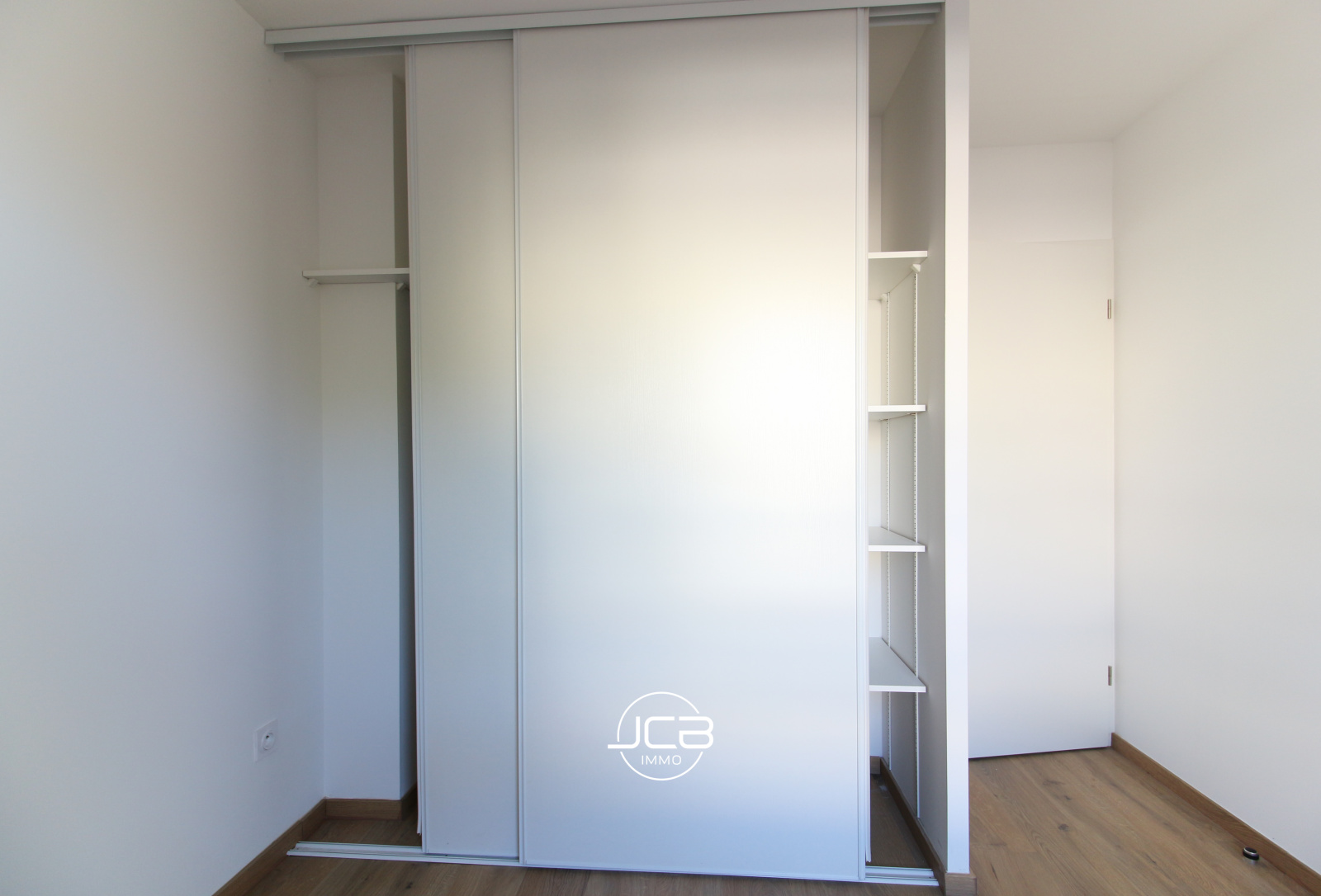 L'apaprtement se compose d'une entrée avec placard, un séjour, une cuisine ouverte aménagée, deux chambres dont une avec placard, une salle de bains, un WC et un balcon.