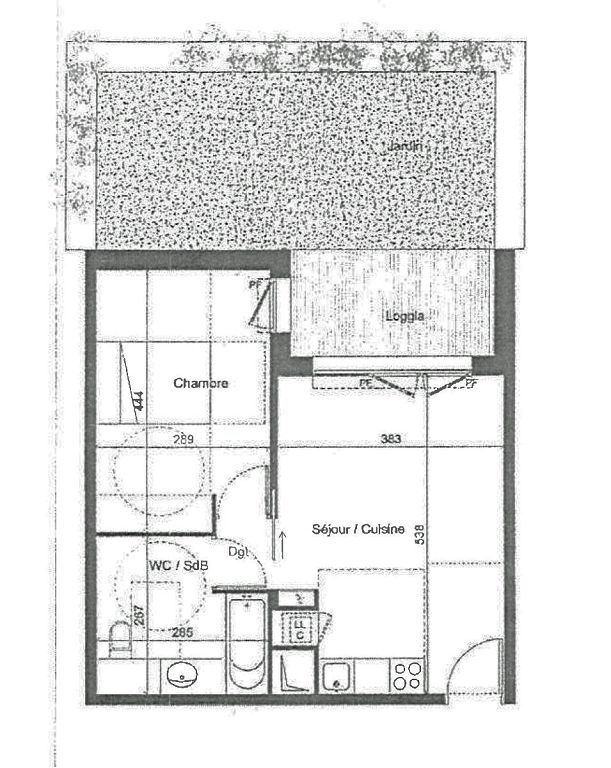Il comprend un séjour ouvert sur une cuisine aménagée (hotte aspirante, plaques vitrocéramiques, un frigo, placards de rangements), une chambre avec placard et une salle d'eau avec WC.